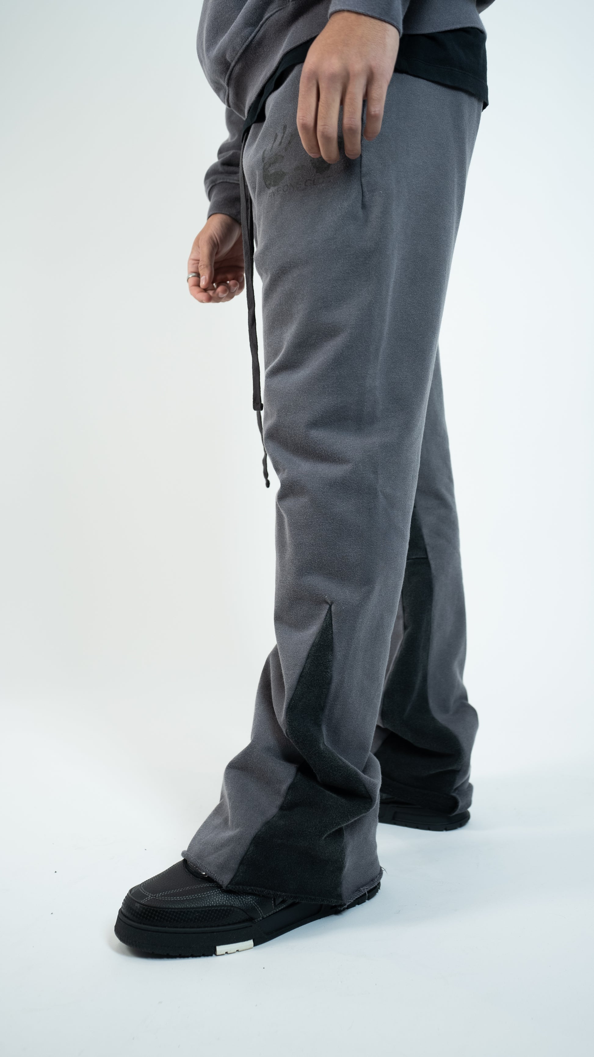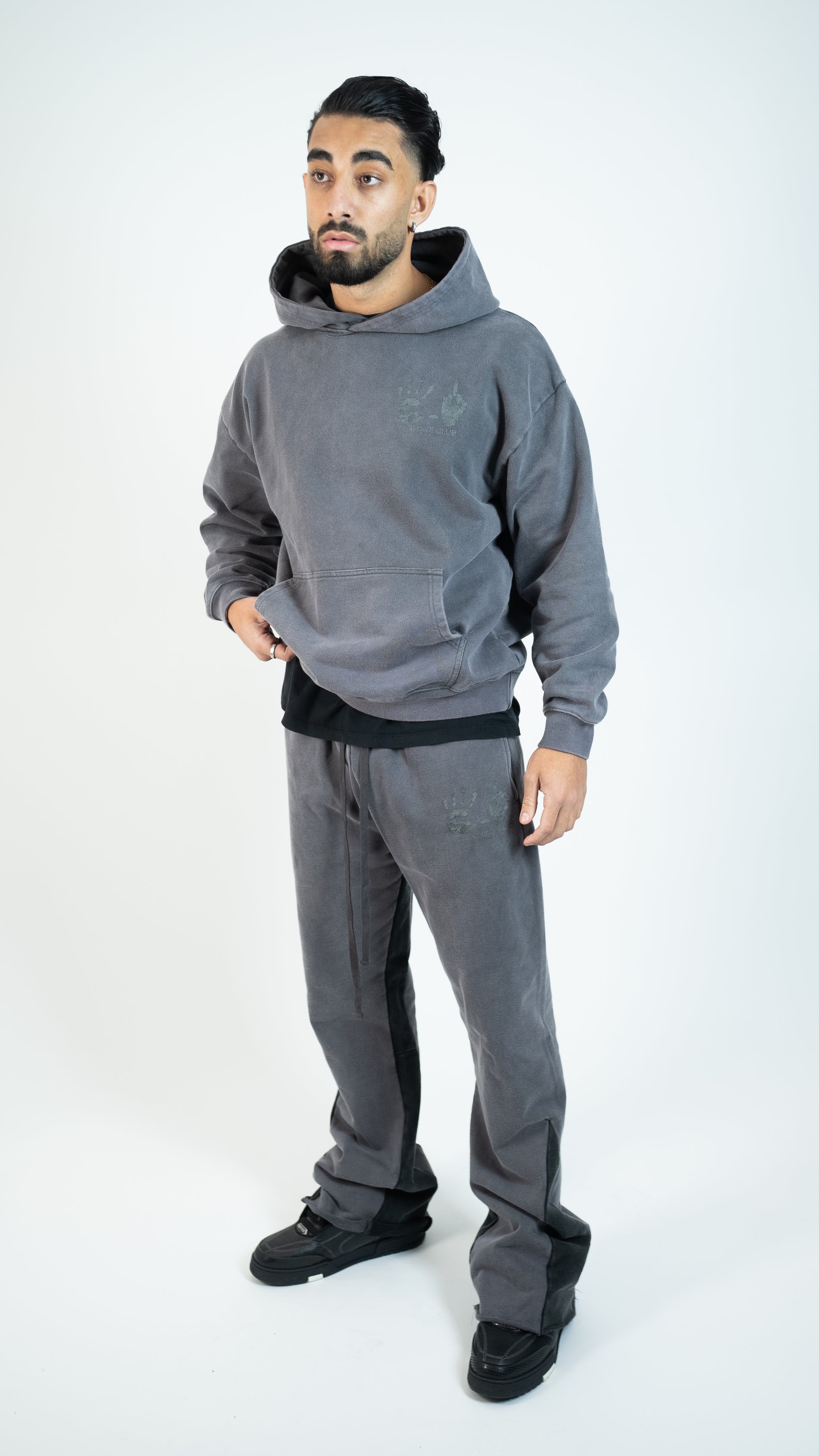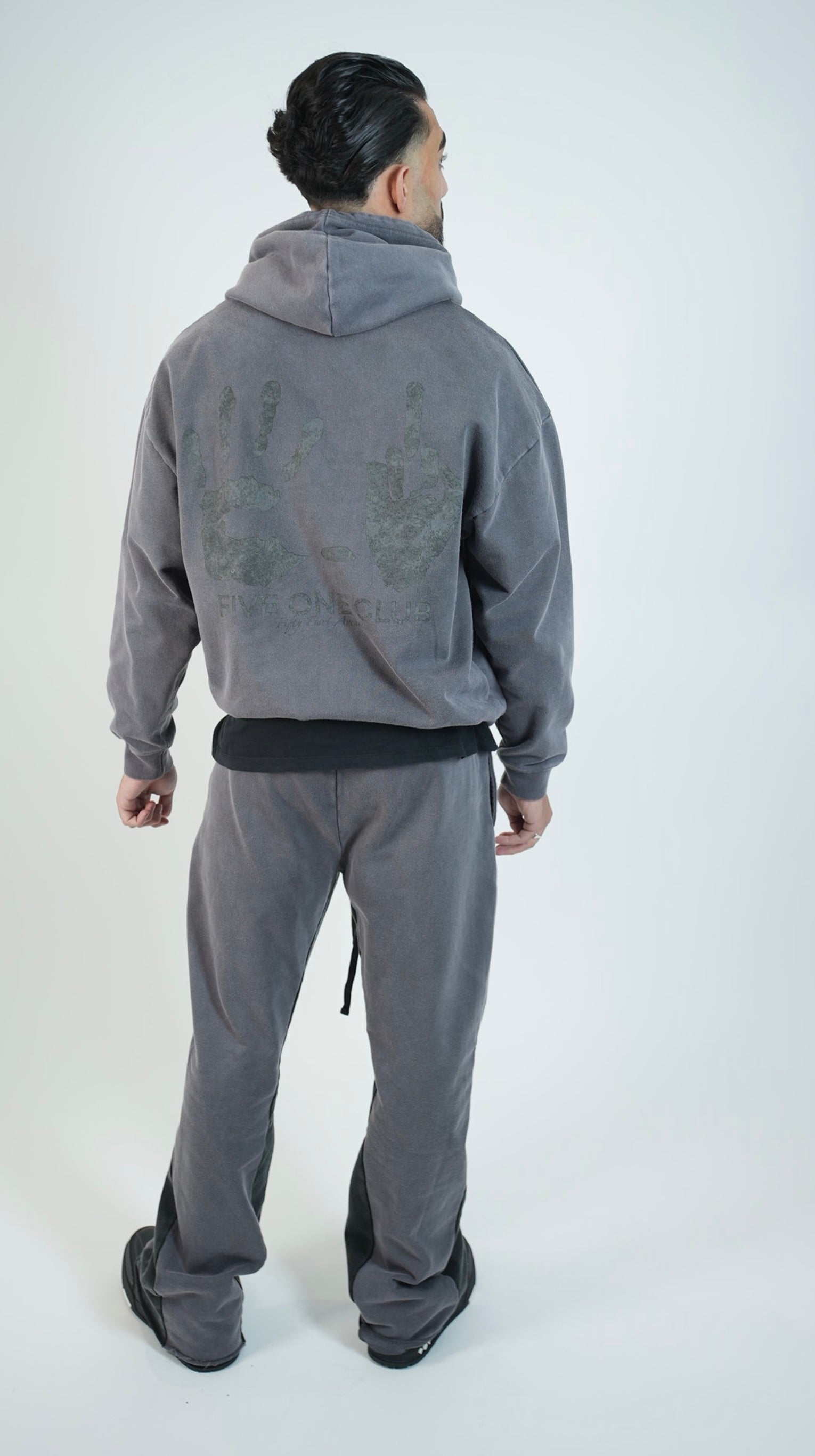 Five One Nova Grey Trackset - 480gsm, digital printed logo and emblems, unisex, relaxed fit with flared bottoms, long sleeve, Model is 5’11, wearing a size medium.